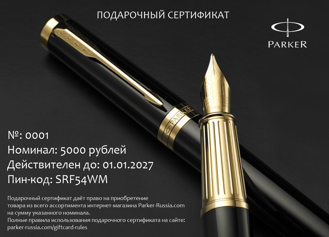 Подарочный сертификат Parker 7000 от официального дилера Parker в Новокузнецке. Вы можете дополнительно заказать гравировку, которая подчеркнет Вашу оригинальность и придаст памятность статусному подарку. Все ручки Паркер поставляются в фирменном футляре.